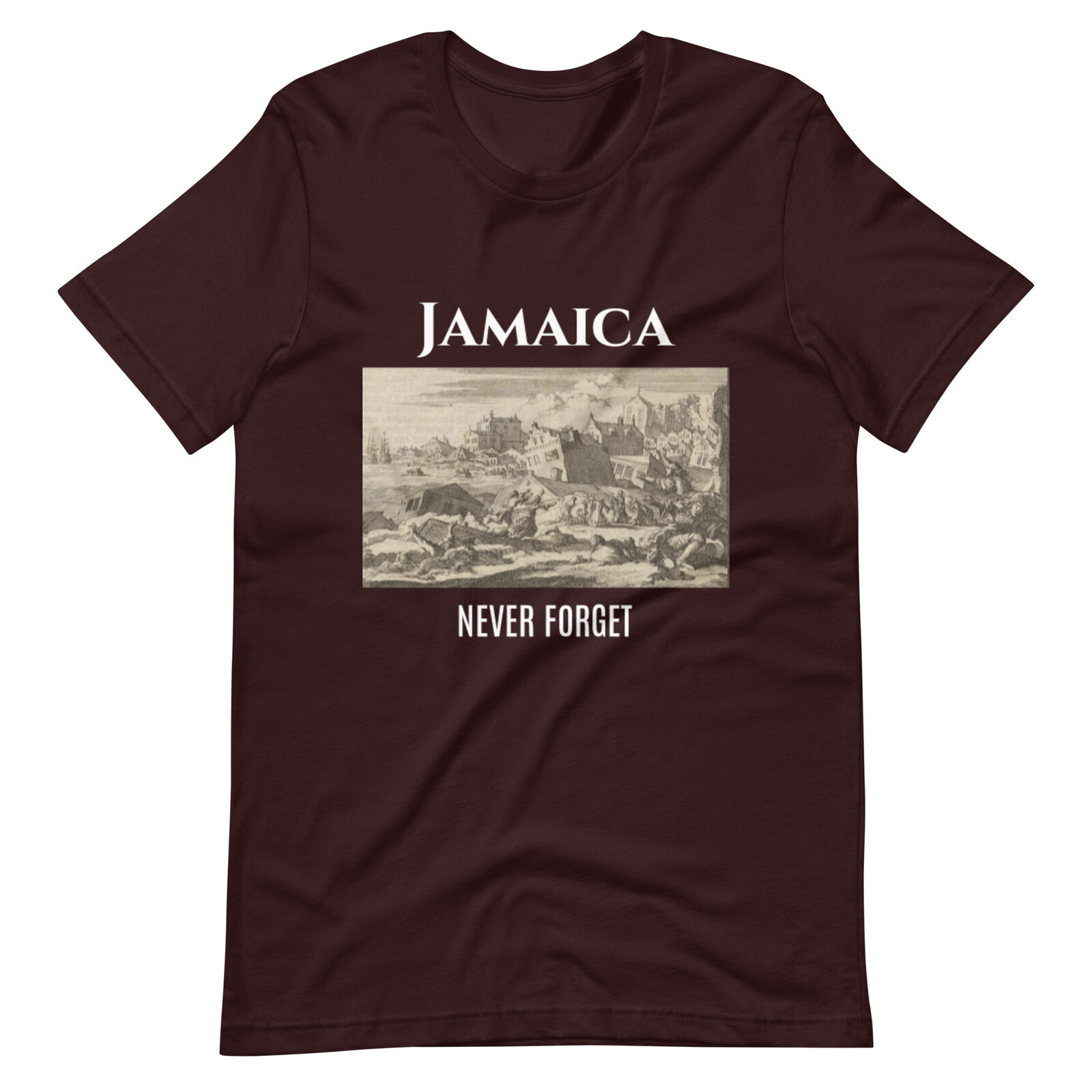 “Jamaica Never Forget” T-shirt. A massive Earthquake Struck Jamaica on June 7, 1692, costing thousands of lives. Their memory must not be lost!