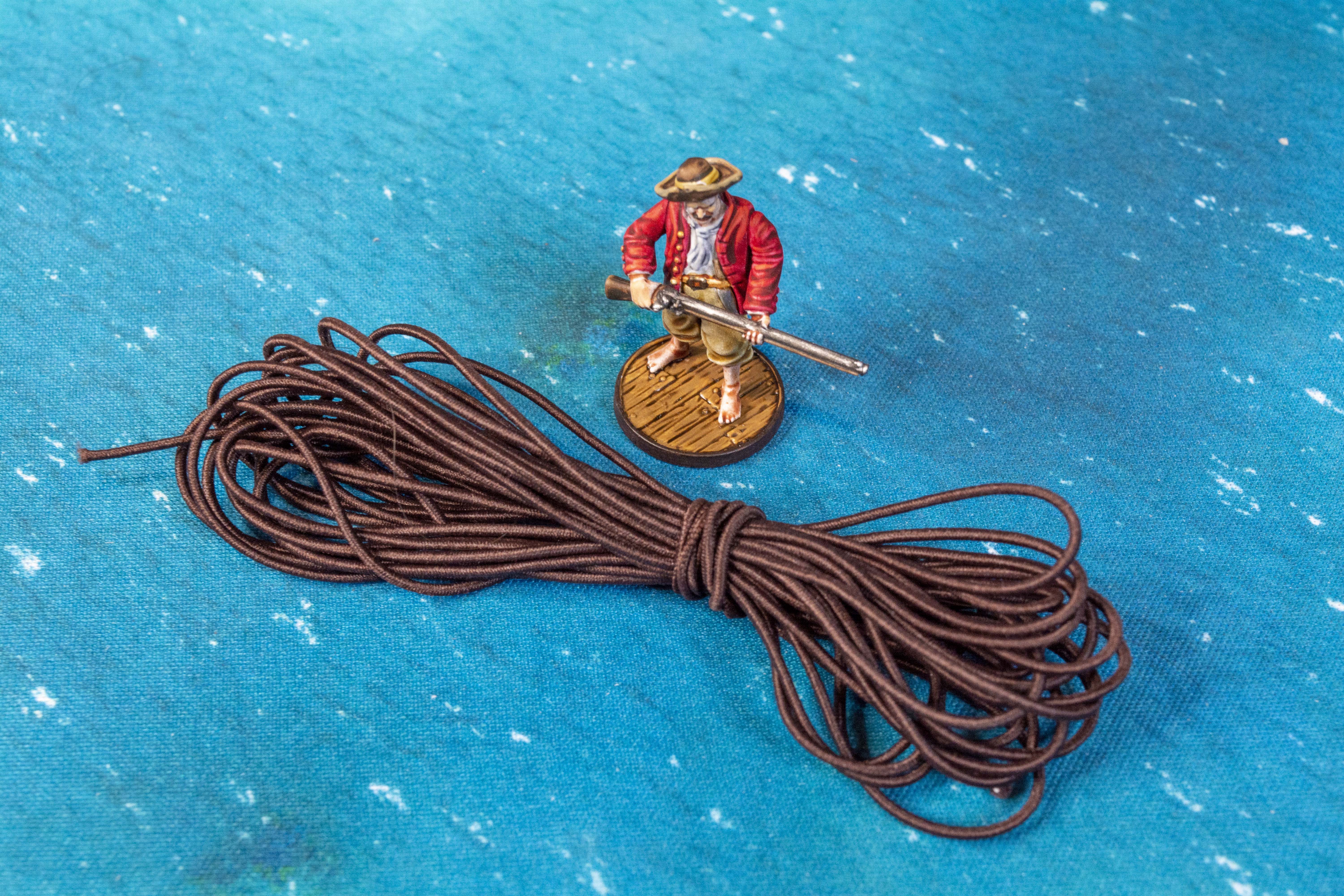 This brown elastic cord is perfect for rigging your Blood & Plunder ship. Easy to work with and affordable. Around 30ft. Enough to rig the largest of ships, or several small ships.
