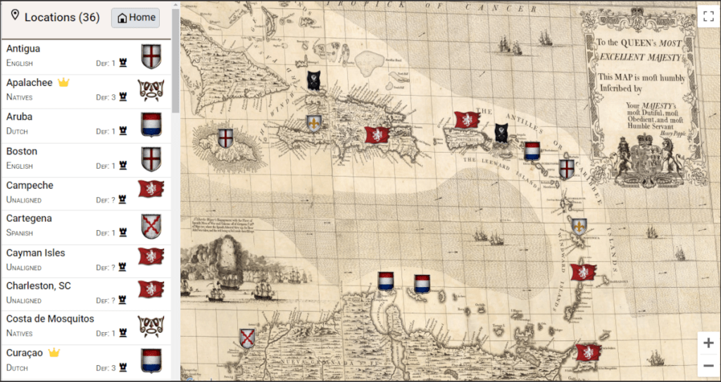 - Two Fixed Grand Alliances – English/Dutch/Pirates vs. French/Spanish/Native Americans