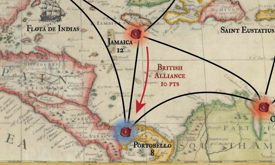 - The French Alliance currently has a Strength of 8 in Portobello. This results in both alliances losing 8 Armies and the British Alliances takes Portobello with 2 surviving Armies.
