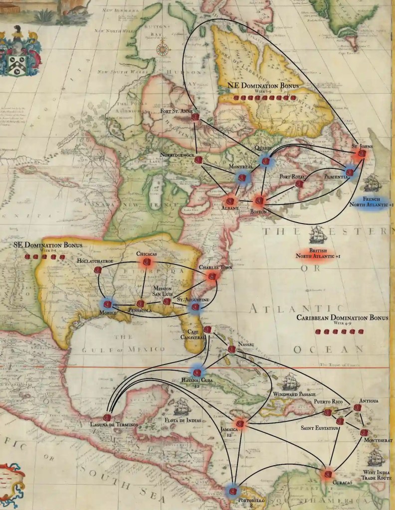 Example: England and France BOTH attack with 3 Pts against the Dutch defense of 2 in Bonaire. The Dutch are defeated, but there is a tie among the Attackers. Bonaire becomes Unaligned. - After all combat is resolved, each nation will earn 1 pt per Location they own and 2 pts per Capital that they control. Points are accumulated over the 9 weeks to determine the overall national winner.